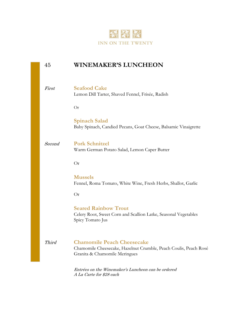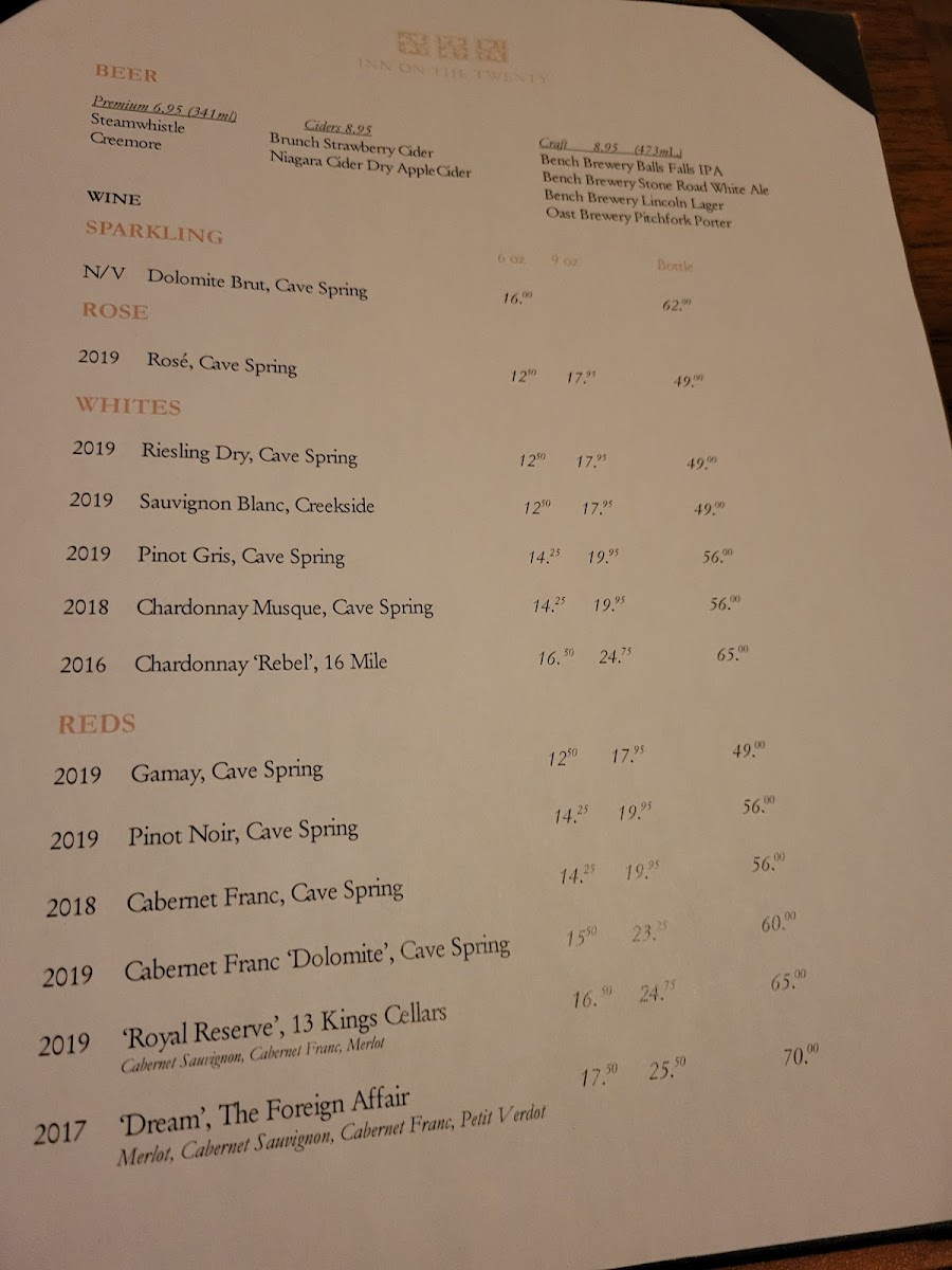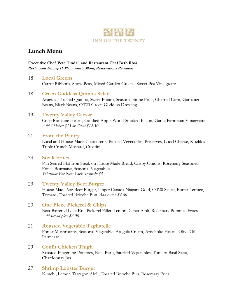 Welcome to Inn On The Twenty Restaurant, where culinary artistry meets rustic charm. Nestled in the picturesque Jordan Station, this dining gem offers a meticulously curated menu that showcases the best of seasonal ingredients. Enjoy the Winemaker's Luncheon, featuring dishes like the delightful Seafood Cake with lemon dill tartar and seasoned Pork Schnitzel with warm German potato salad, each priced at CA$45.00. For dinner, savor the Twenty Valley Caesar with crisp romaine and candied bacon or indulge in Seared Scallops paired beautifully with double-smoked bacon and braised lentils, creating an explosion of flavors.